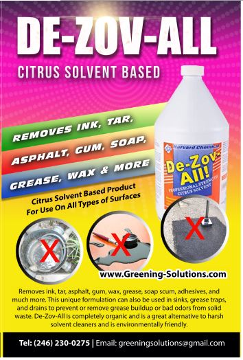 De-Zov-All is a safe, citrus solvent based product for use on all types of surfaces to instantly remove ink, tar, asphalt, gum, wax, grease, soap scum, adhesives, and much more. This unique formulation can also be used in sinks, grease traps, and drains to prevent or remove grease buildup or bad odors from solid waste. De-Zov-All is completely organic and is a great alternative to harsh solvent cleaners and is environmentally friendly.